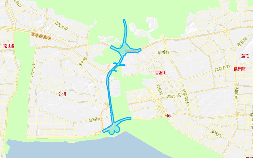 深圳市交通公用设施建设中心来文申请办理侨城东路北延通道工程项目用地预审与选址意见书,该项目为深圳市市政工程项目,申请用地范围位于侨城东路北延工程北起龙华区龙澜大道-福龙路立交,往西南下穿羊台山后,与规划宝鹏通道、沙河西路北延道路衔接,并下穿深圳大学二期规划用地、西丽高尔夫用地、塘朗工业区、塘朗山,与北环大道衔接,穿安托山片区,并沿现状侨城东路新建地下复合隧道,止于滨海大道。福田段用地面积824145.37平方米,其中531423.41平方米位于基本生态控制线范围内。(示意图见附件)