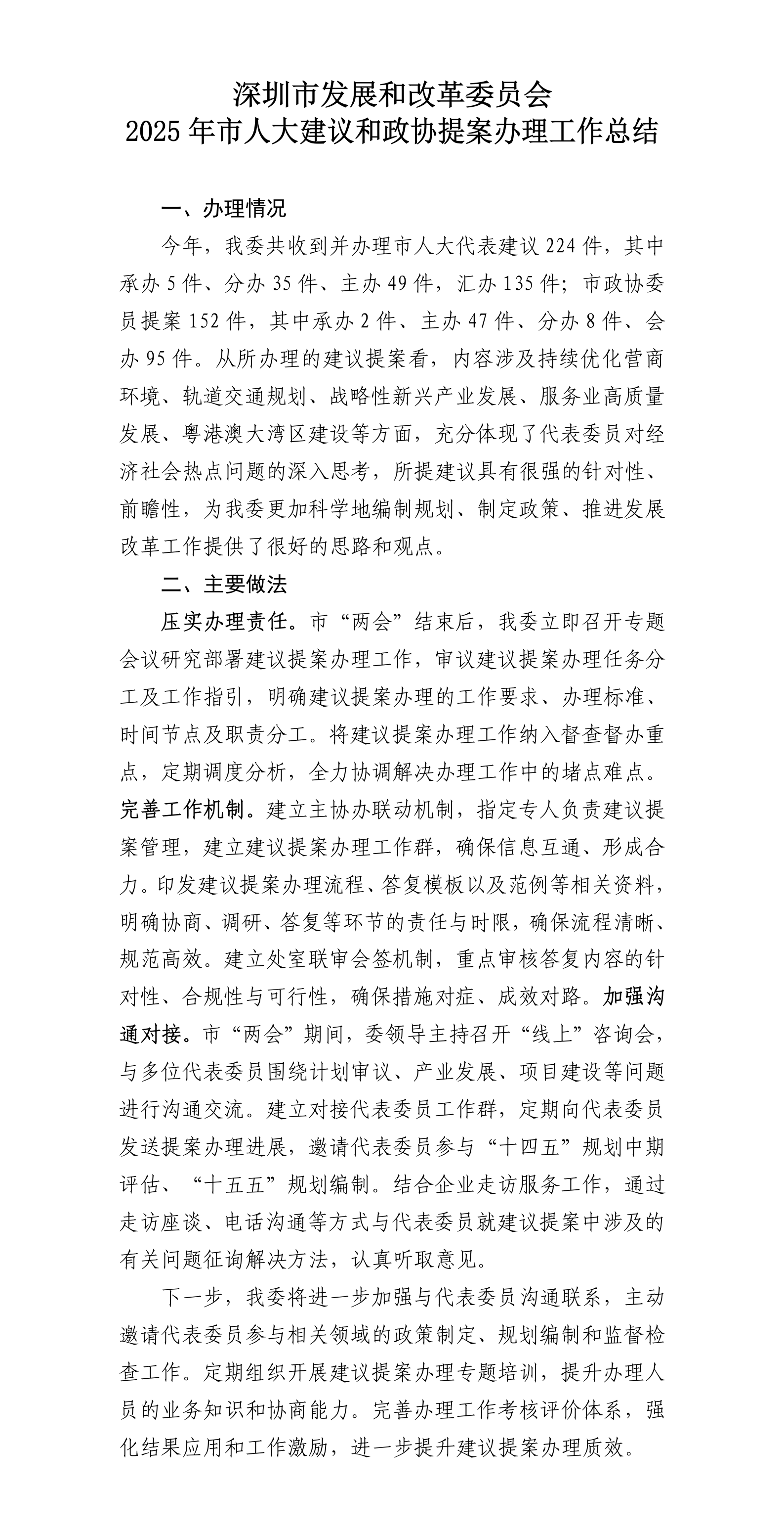 深圳市发展和改革委员会2025年市人大建议和政协提案办理工作总结