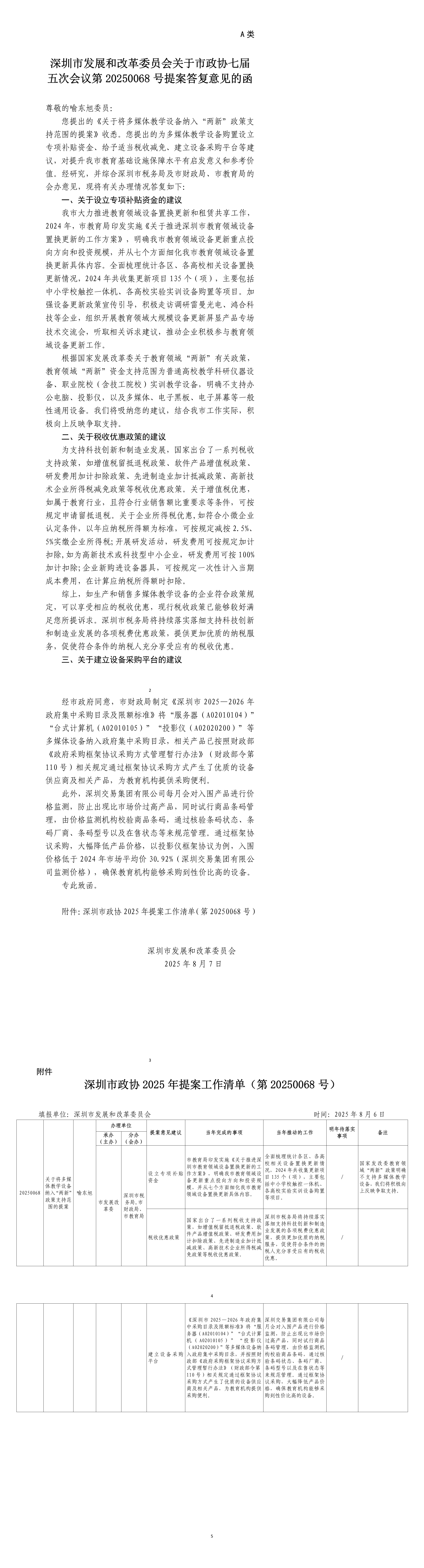深圳市发展和改革委员会关于市政协七届五次会议第20250068号提案答复意见的函
