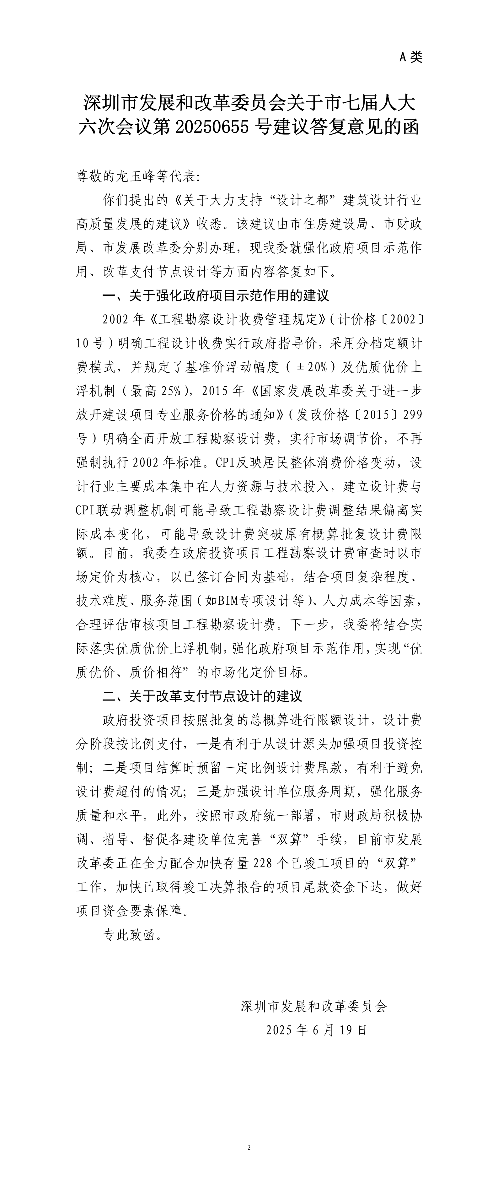 深圳市发展和改革委员会关于市七届人大六次会议第20250655号建议答复意见的函