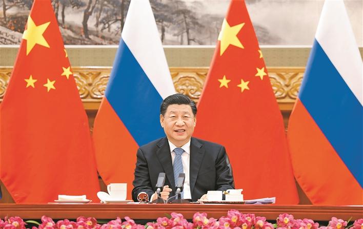 习近平强调,当前,世界百年变局和世纪疫情交织影响,世界进入动荡变革期。中俄关系经受住各种风浪考验,展示出新的生机活力。我同总统先生通过多种方式就重大议题保持沟通和协调,共同为中俄关系把舵领航。双方正式宣布《中俄睦邻友好合作条约》延期并赋予其新的时代内涵,在涉及彼此核心利益问题上坚定相互支持,捍卫了各自国家尊严和两国共同利益。
