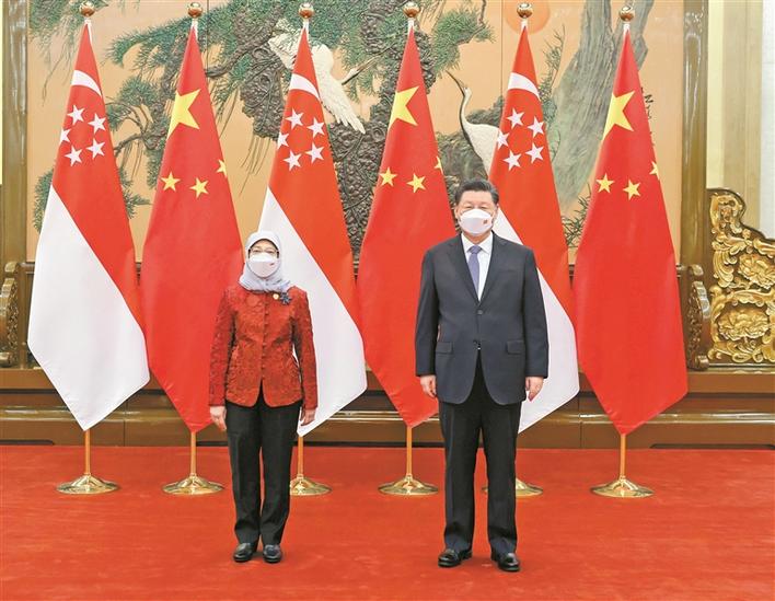国家主席习近平6日上午在人民大会堂会见来华出席北京2022年冬奥会的新加坡总统哈莉玛。