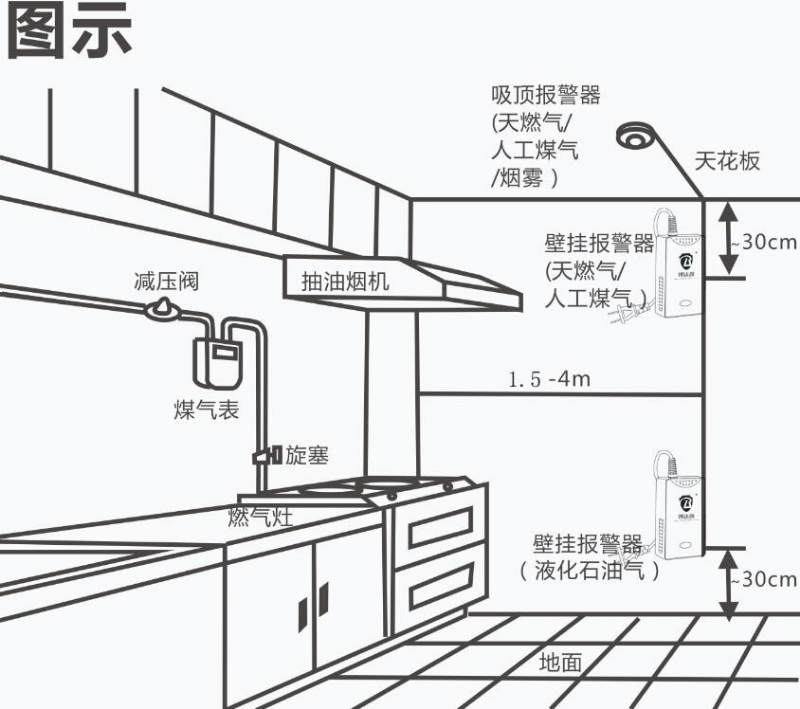 ·液化气(比空气重):距地面约0.3米处,靠近燃气表或管道接口。