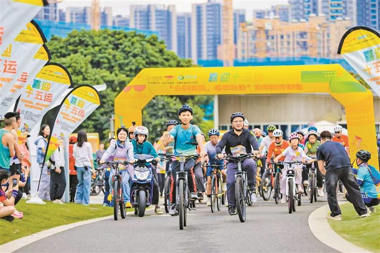 十五运会竞速小轮车赛场设在深圳光明区凤凰街道。昨日,凤凰街道举行了一场骑行嘉年华,清晨7时50分,数百市民在明湖城市公园开启“骑”迎十五运会活动,参与者覆盖老中青多个年龄段,勾勒出一幅生动的全民健身图景。