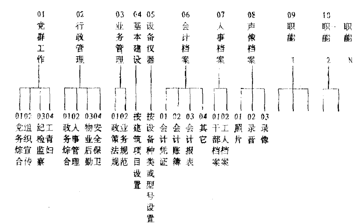 图中O1-08为通用类型的类目,09之后为职能类型的类目。任何立档单位的档案全宗都是由上述两大类型档案组成,不同的单位可能有不同的通用类,可能编到09、10……,其职能类序号相应顺延。其中职能类型1-N是一个单位档案的主要类别,要根据立档单位的主要职能活动的实际来设置。